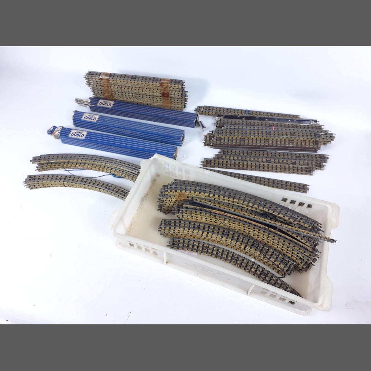 A large quantity of HORNBY-DUBLO track to include curved tracks approx 30 and 34cm long and straight tracks approx 30cm long all contained within a useful plastic box