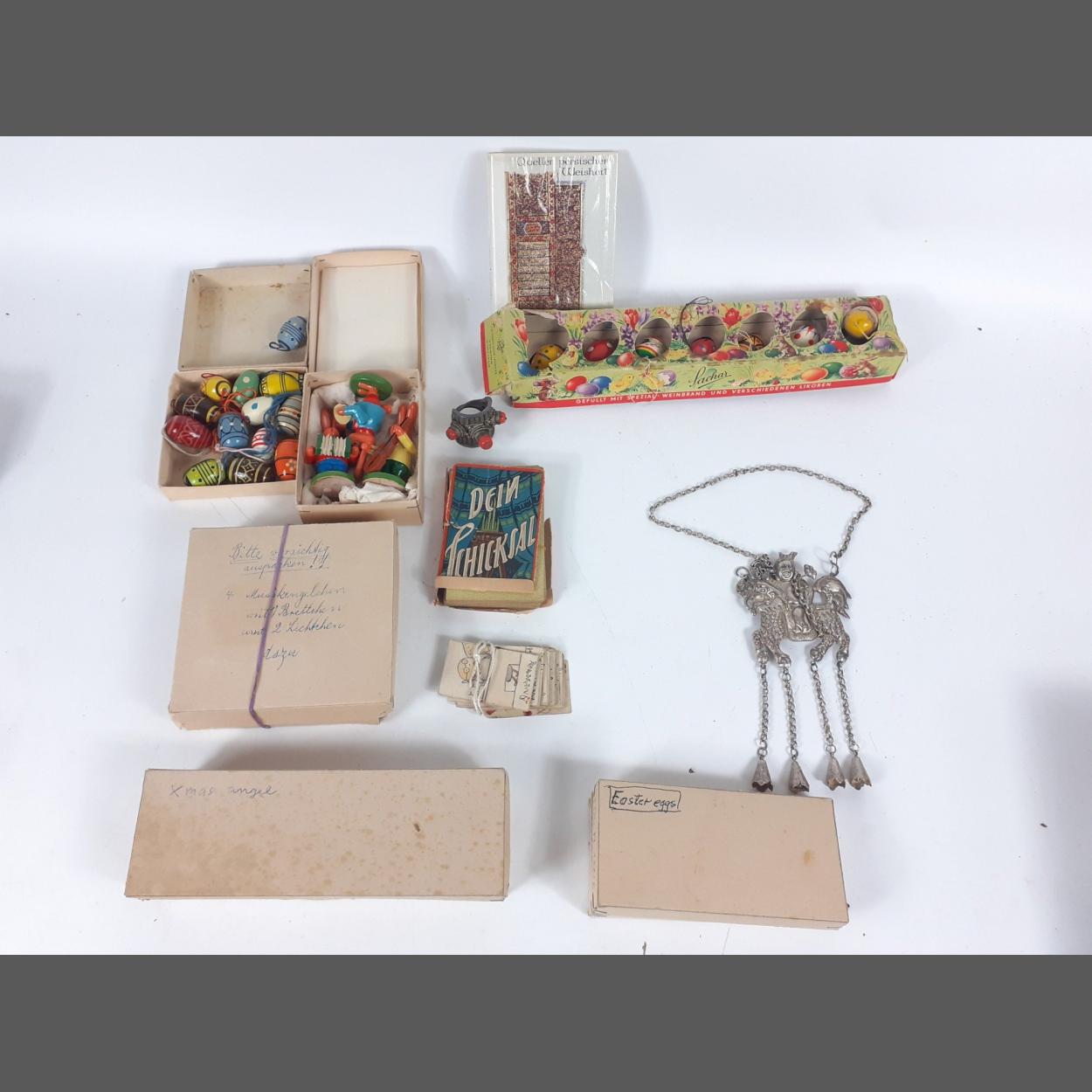 A CHARMING collection Easter figures to include 2 wooden hares with musical instruments, a quantity of small wooden Easter eggs for hanging on trees (approx 3cm in length) plus a wooden angel with brass wings (15cm tall approx), and a box with 4 Margarite musical angels by EHO KUNST (1 figure damaged)