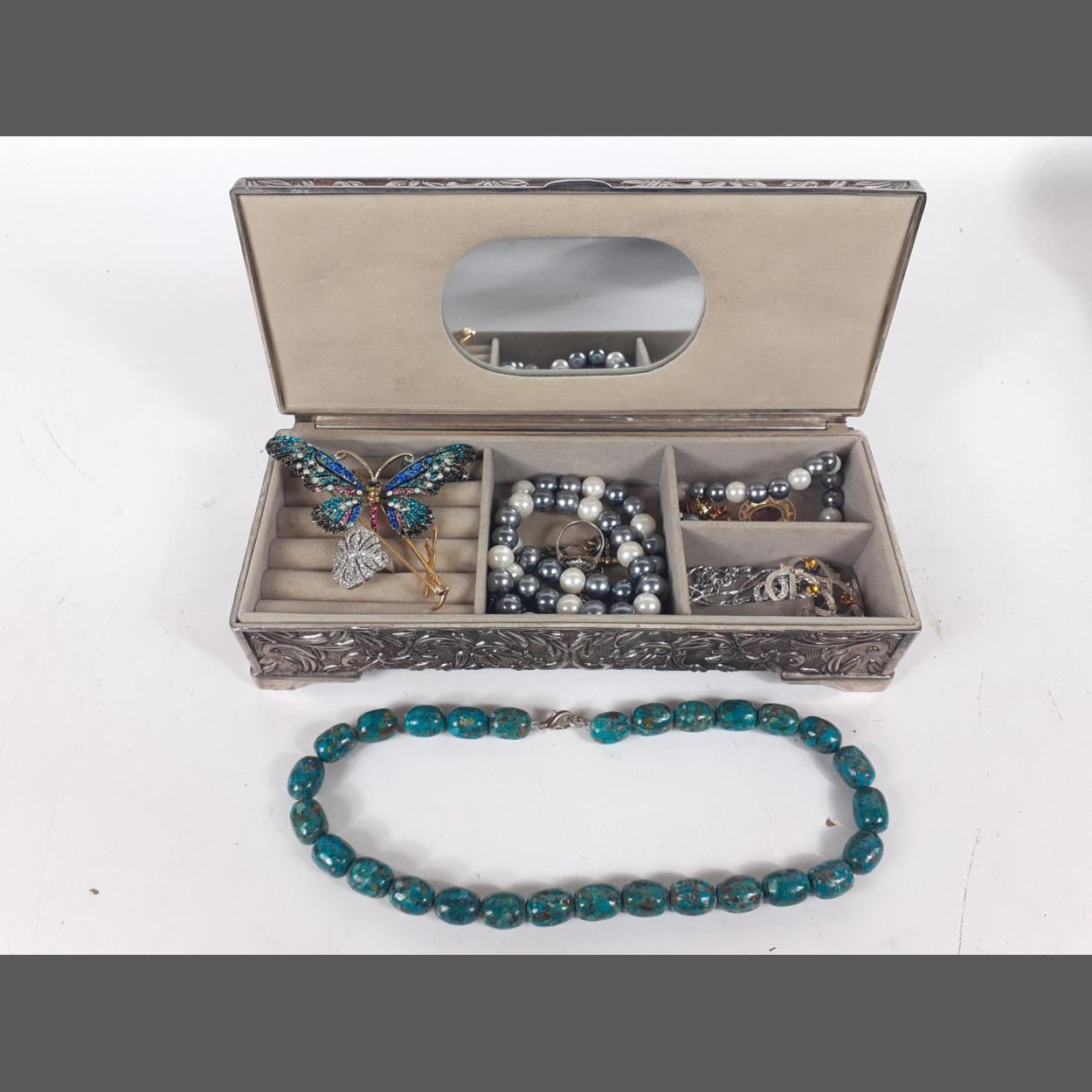 A white metal jewellery box 23x9x5cm with contents of costume jewellery and a ring set with clear stones stamped silver, Size K, gross weight 2.5g