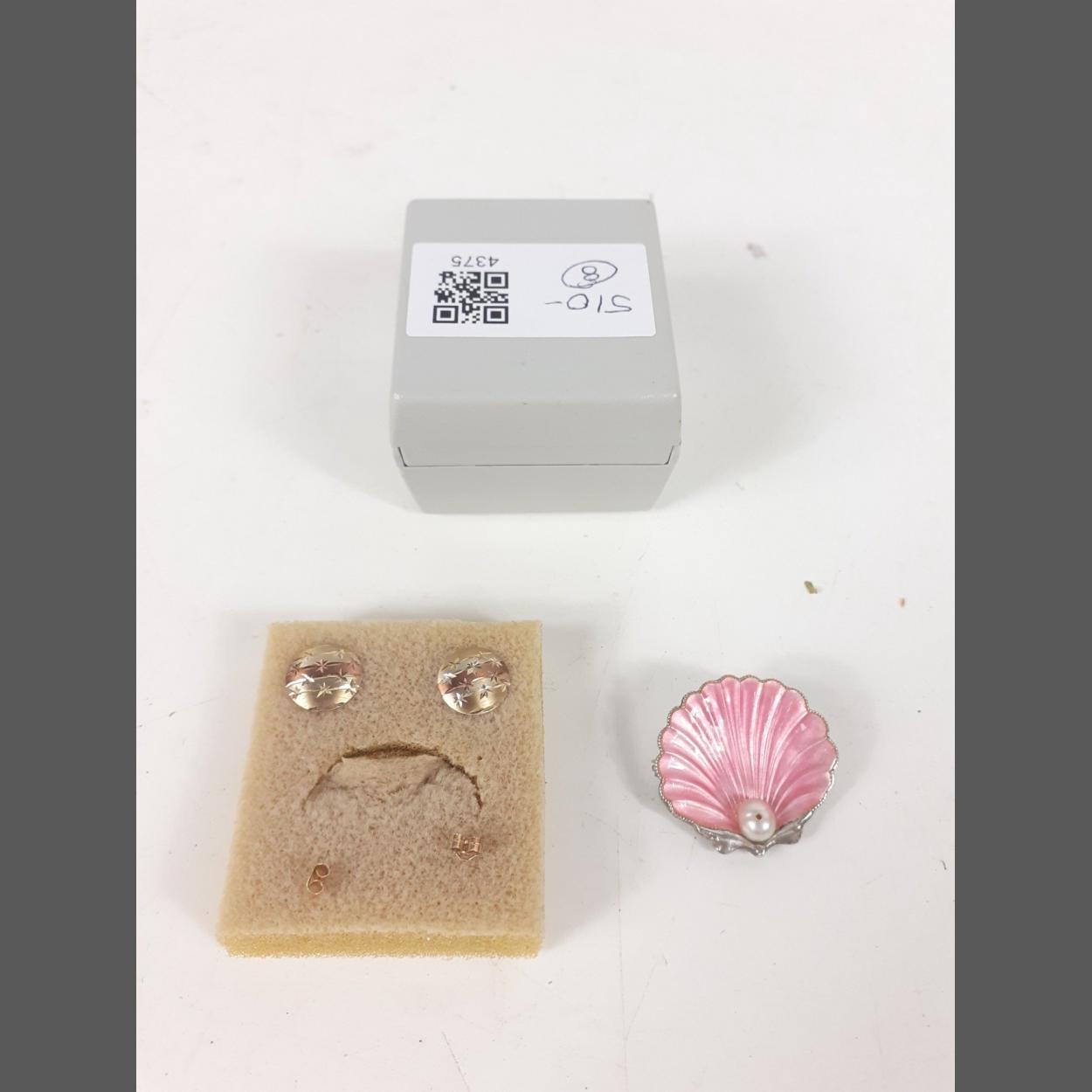 A pink enamel and pearl shell brooch stamped silver, 2.5cm long, gross weight 6.50g plus a pair of gold earrings weight 0.45g