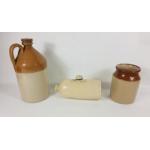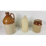 Two STONEWARE jugs (including one by 'MOIRA') and another stoneware cylinder. The largest complete with handle and stopper. Largest 34.5cm tall, medium sized piece 28.5cm tall and the smallest 20cm tall. All in good condition.