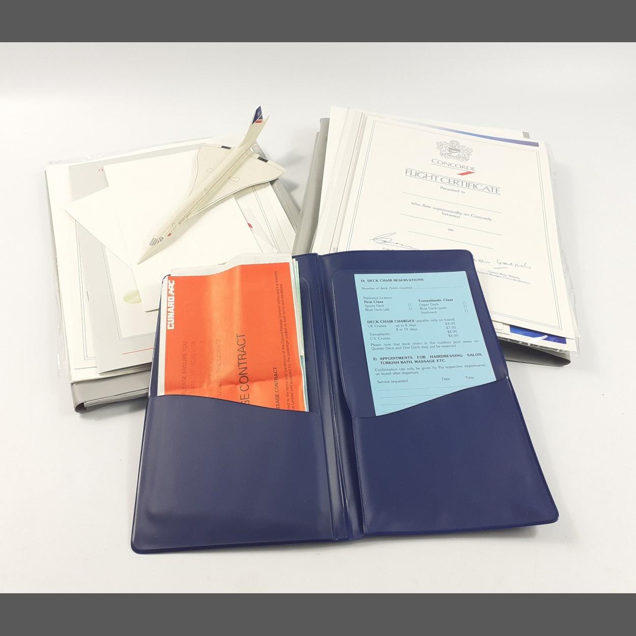 Dreams of yesteryear - memorabilia commemorating 10 years of the BRITISH AIRWAYS CONCORDE (1976-86) in 2 grey plastic wallets including stationery, blank certificates of flight and 1 pair of BA flight socks as well as a model of the aircraft (25cm long), also tickets from a first class trip from Southampton to New York in 1986 on the QE2 along with an unused form to order wine, flowers and canapes on departure and also to book a deckchair on one's preferred deck (no towels at dawn here)