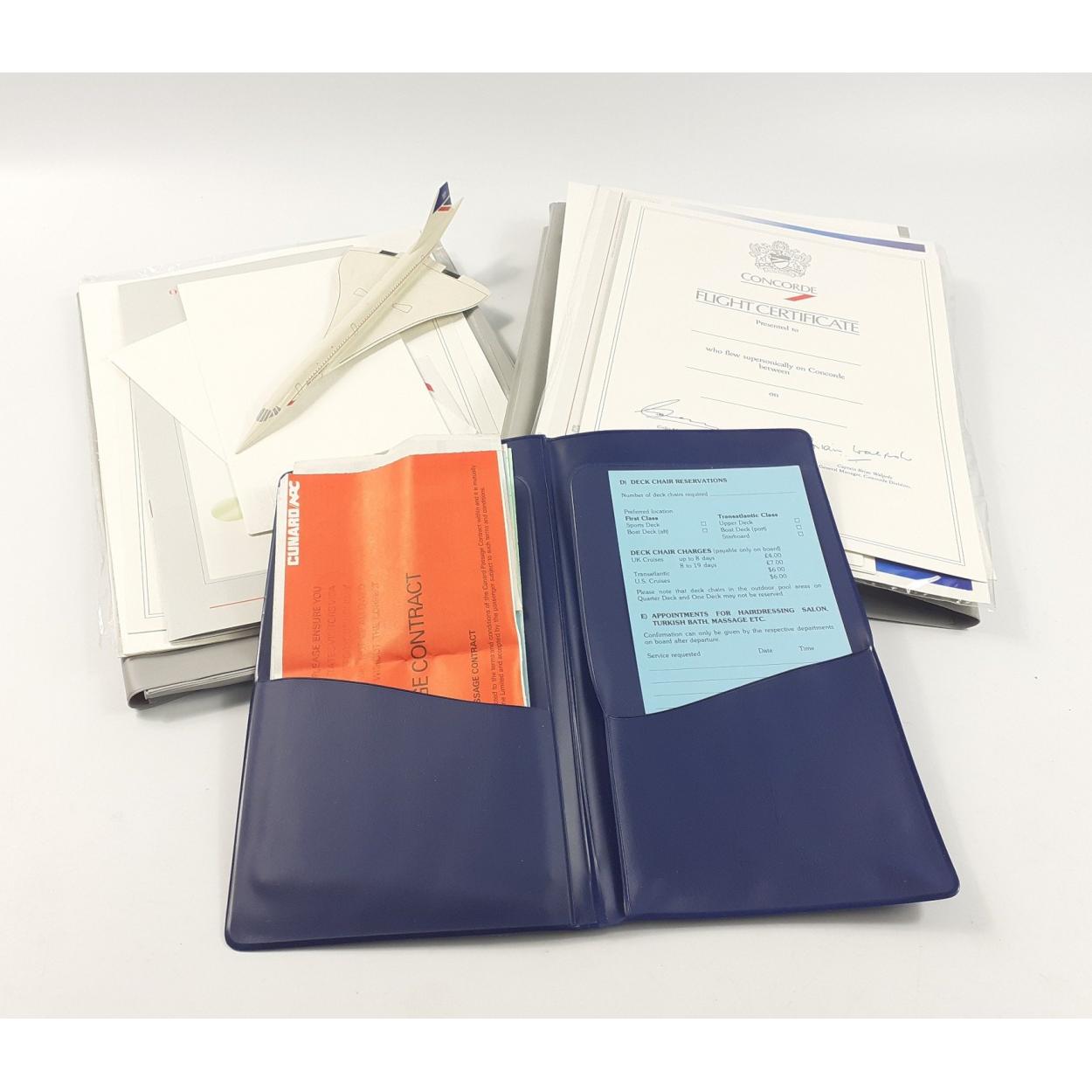 Dreams of yesteryear - memorabilia commemorating 10 years of the BRITISH AIRWAYS CONCORDE (1976-86) in 2 grey plastic wallets including stationery, blank certificates of flight and 1 pair of BA flight socks as well as a model of the aircraft (25cm long), also tickets from a first class trip from Southampton to New York in 1986 on the QE2 along with an unused form to order wine, flowers and canapes on departure and also to book a deckchair on one's preferred deck (no towels at dawn here)