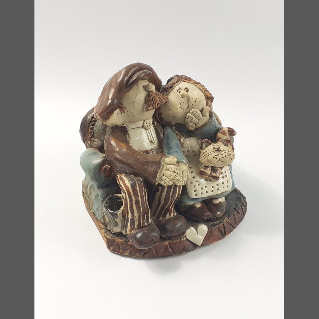 A homely scene of wife, husband and cat sitting together hand-crafted in clay stands approx 15cm high - a heavy item!