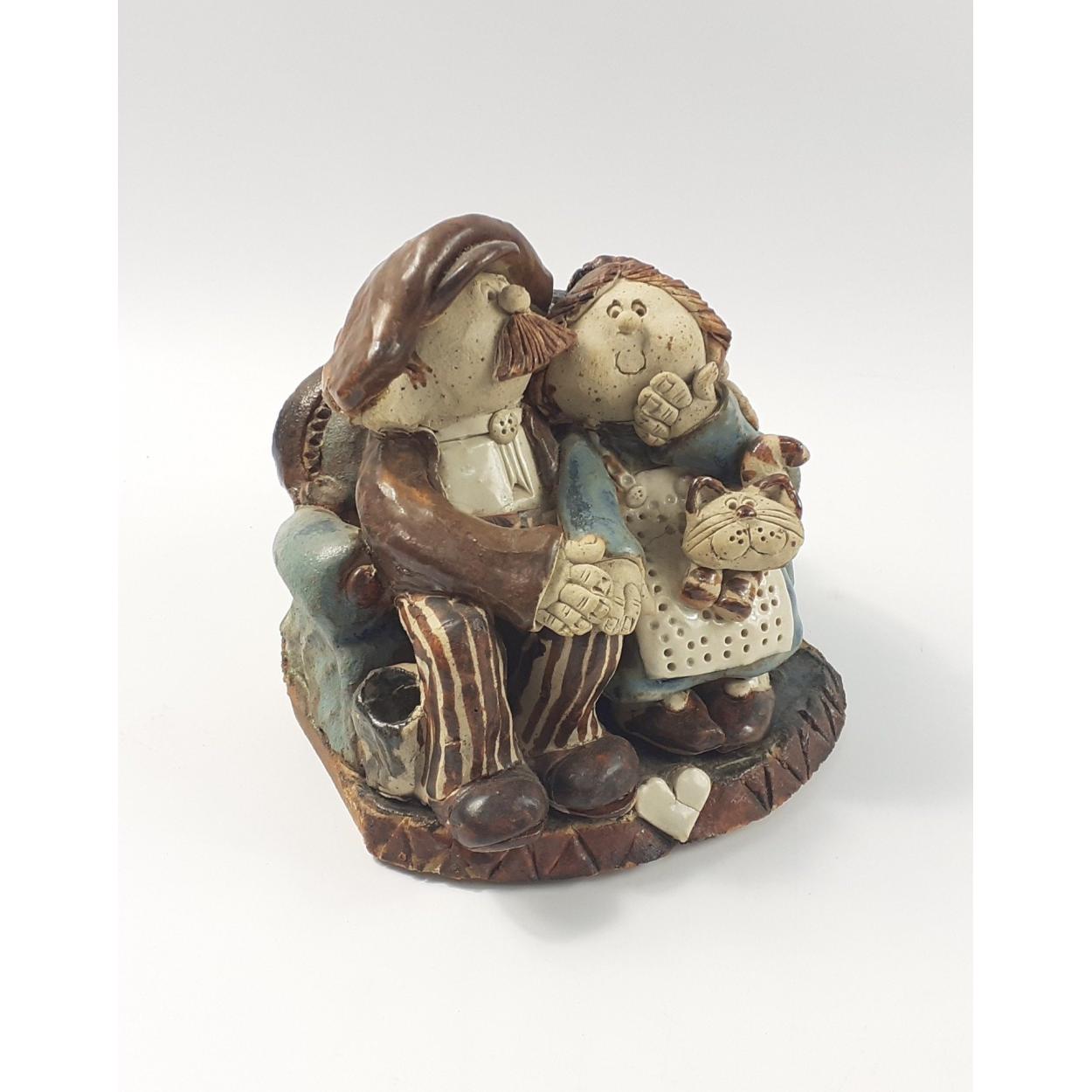 A homely scene of wife, husband and cat sitting together hand-crafted in clay stands approx 15cm high - a heavy item!