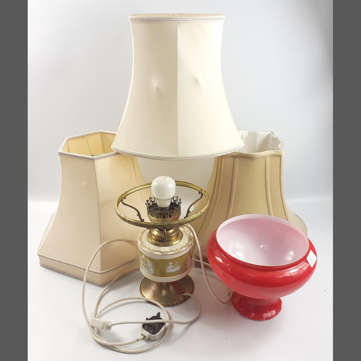 AN INTERESTING, MIXED collection of lamp shades and lamp bases as well as a glass vase 27.9cm tall and a red vase/lamp shade, 18cm tall and 23.7cm wide at top. Condition - All in good/fair condition.