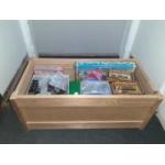 A wooden chest 70x36x30cm approx full of model train items including a box of short lengths of HORNBY-DUBLO track (complement