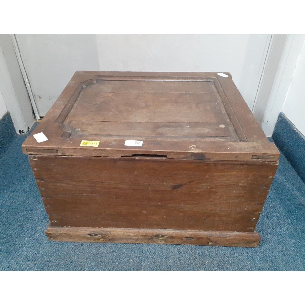 A SUBSTANTIAL OAK CHEST. Perfect for a childs bedroom to store toys or would make a great coffee table top. Inside the chest features a decorative lining inscribed "Nova topics terrarium sive novi orbis tabvla" - A new map of the new world. Dimensions - depth 46.7cm, 53.8cm long at top and 30.7cm tall. Condition - good condition. Has some woodworm damage
