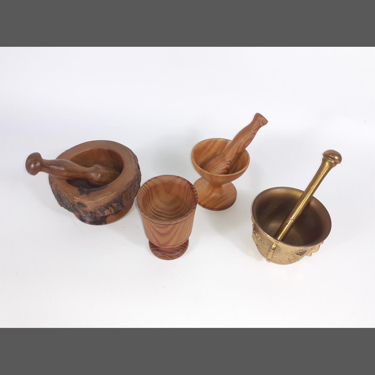An unusual lot of three MORTAR and PESTLES, none of them too heavy to lift, two of these are hand-turned wood and one is brass the tallest being 10x7cm, the brass one 9x7cm, plus a small wooden goblet 8x8cm