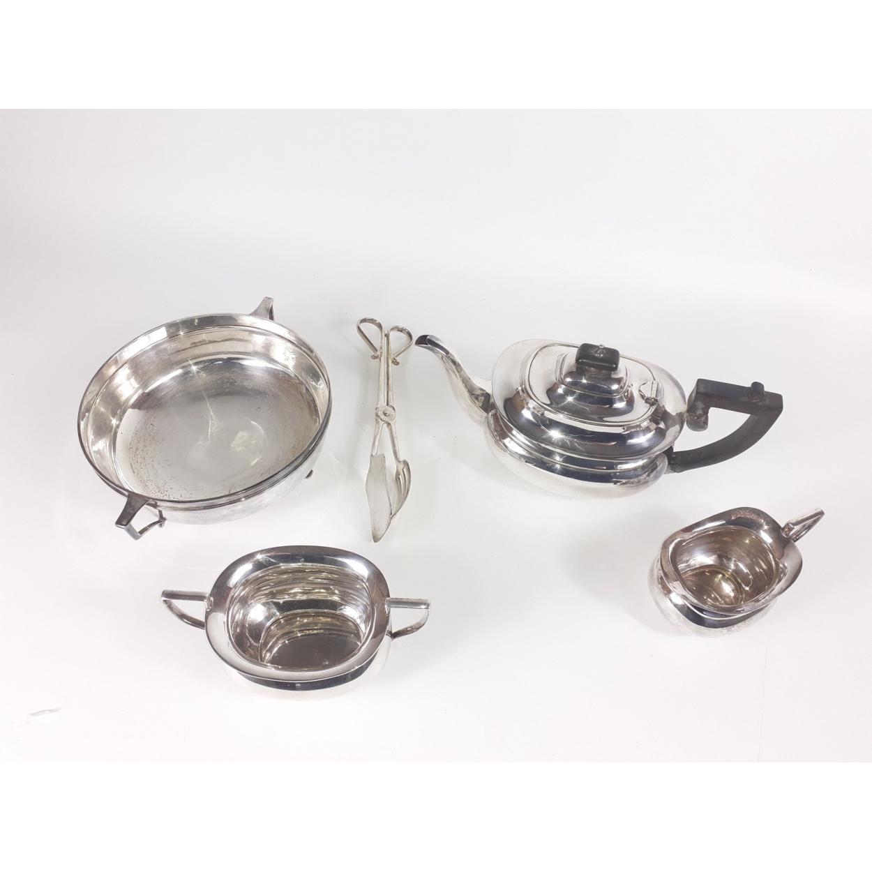 A top quality, vintage EPNS tea service by JM HENDERSON silversmith, to include teapot, milk jug and sugar bowl, lovely condition plus a pair of EP zinc tongs (26cm approx), plus a twin-handled bowl on 3 feet by CG & Co (21cm dia x 8cm high)