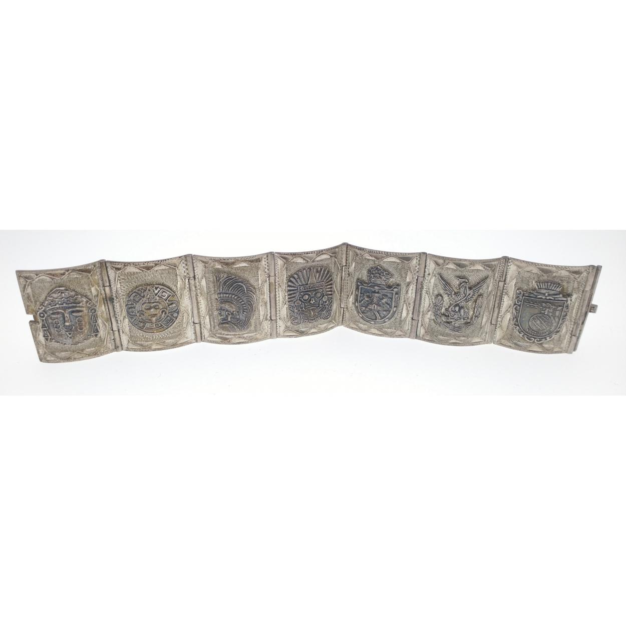 A SUBSTANTIAL MEXICAN SILVER stamped Bracelet with seven AZTEC style panels - weight 66.30g - dimension 17cm long