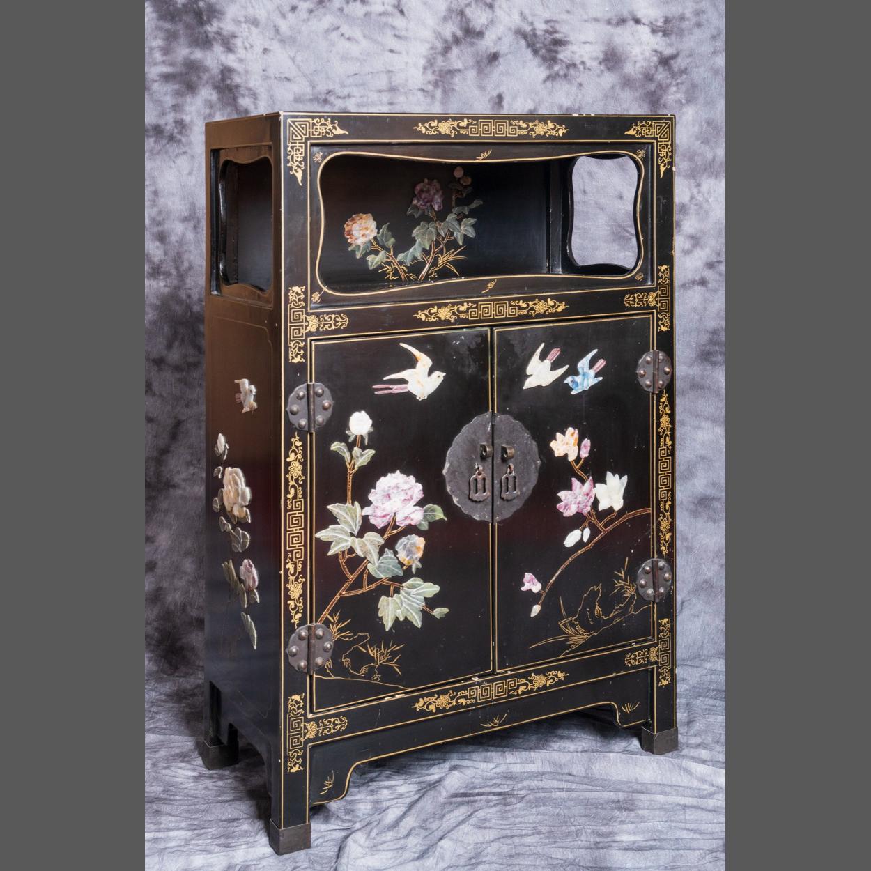 CHINOISERIE cabinet with carved soapstone with wild birds on black lacquer with gilt hand painted decoration - 92cm x 61cm x 30cm Approx
