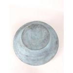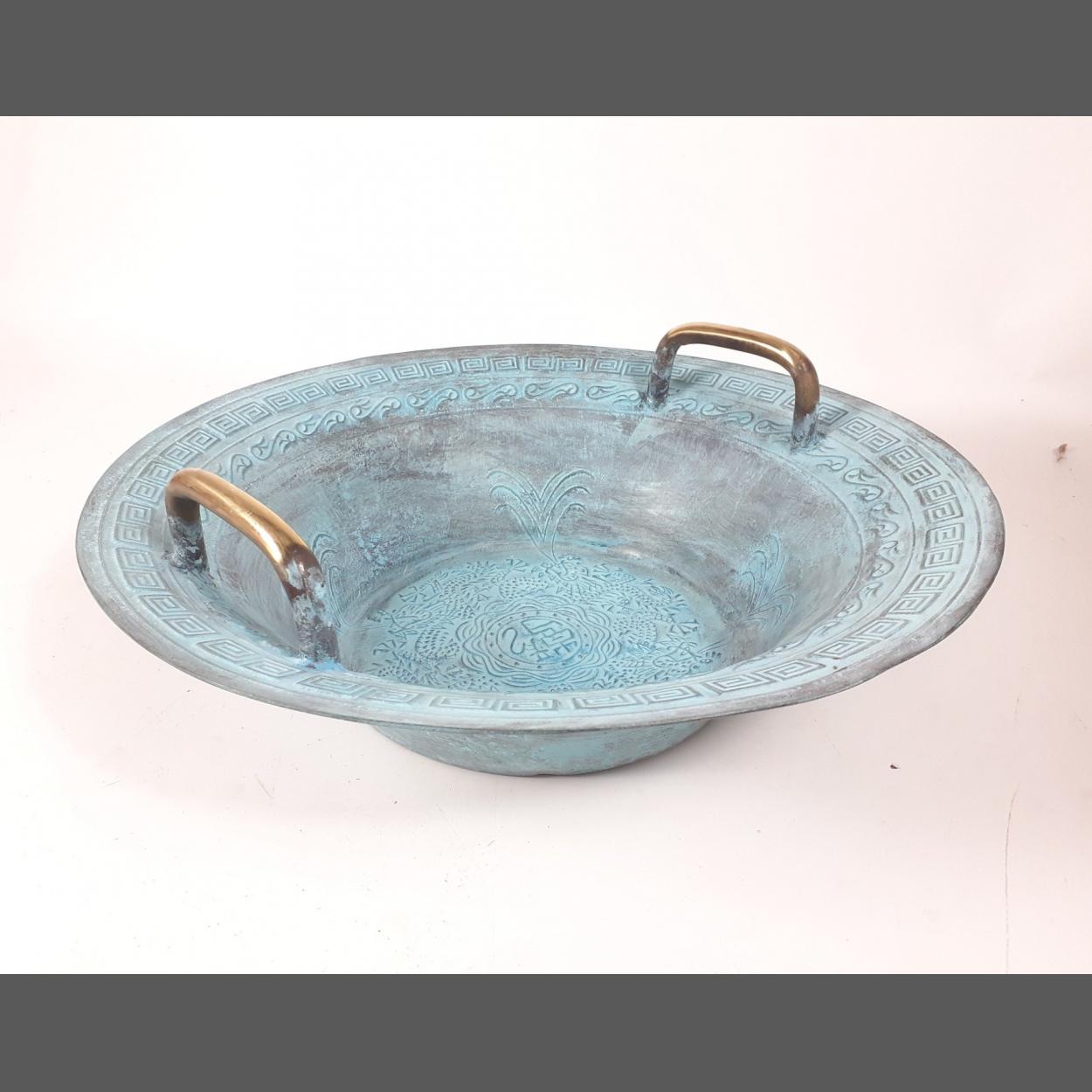 A beautiful verdigris carved INDONESIAN Chinese singing bowl with 2 brass handles 38cm dia 10cm tall, small dent on base