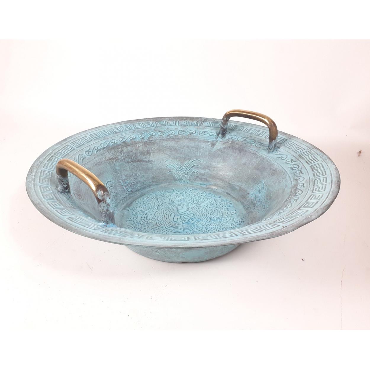 A beautiful verdigris carved INDONESIAN Chinese singing bowl with 2 brass handles 38cm dia 10cm tall, small dent on base