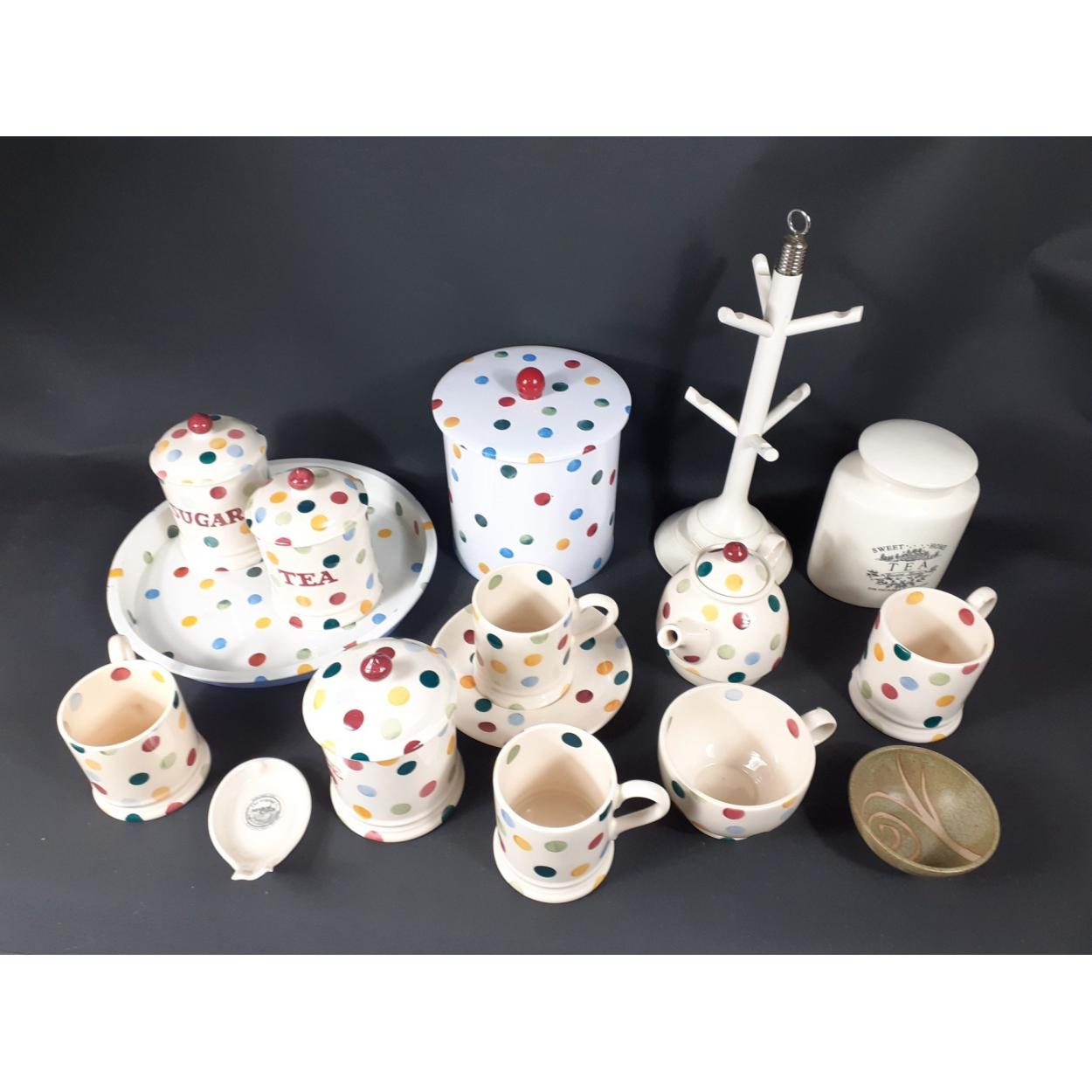 A collection of polka dot ware to include a tea service, 1 large teacup and saucer, a small teapot, 4 mugs, a tin tray, biscuit tin etc