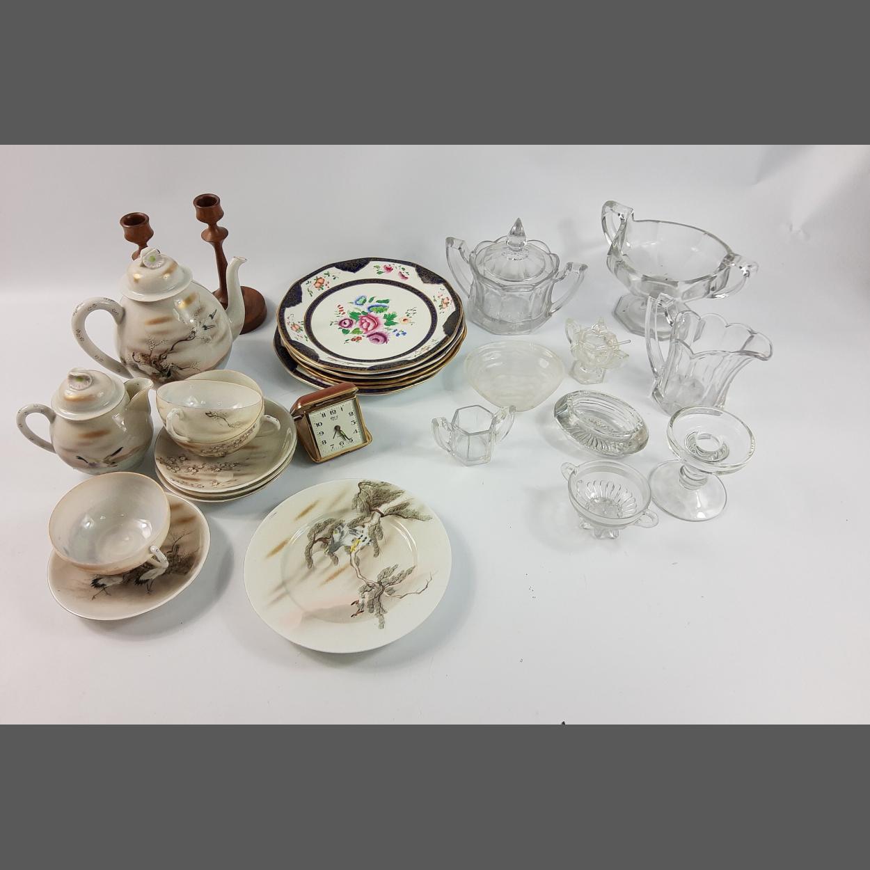 A box of mixed china and glass to include 3 WEDGWOOD Imperial Porcelain plates (23cm), 2 AYNSLEY white plates with blue and gilt rim (23cm), a very fine Oriental tea service comprising 3 cups, 4 saucers, 1 plate, 1 milk jug, plus a glass sugar bowl and milk jug