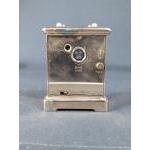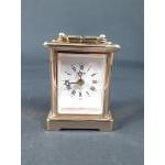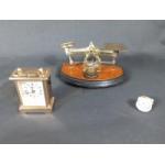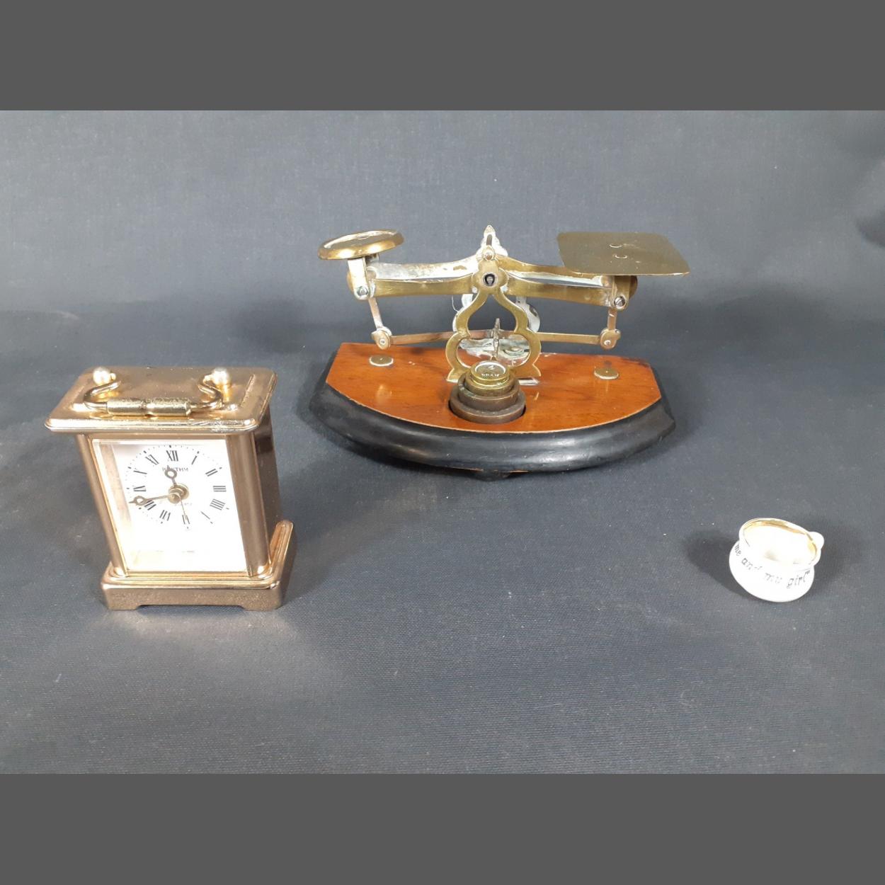 Vintage postal scales with four brass weights - 18cm across approx. Also included a small Rhythm battery carriage clock and a small ceramic chamber pot