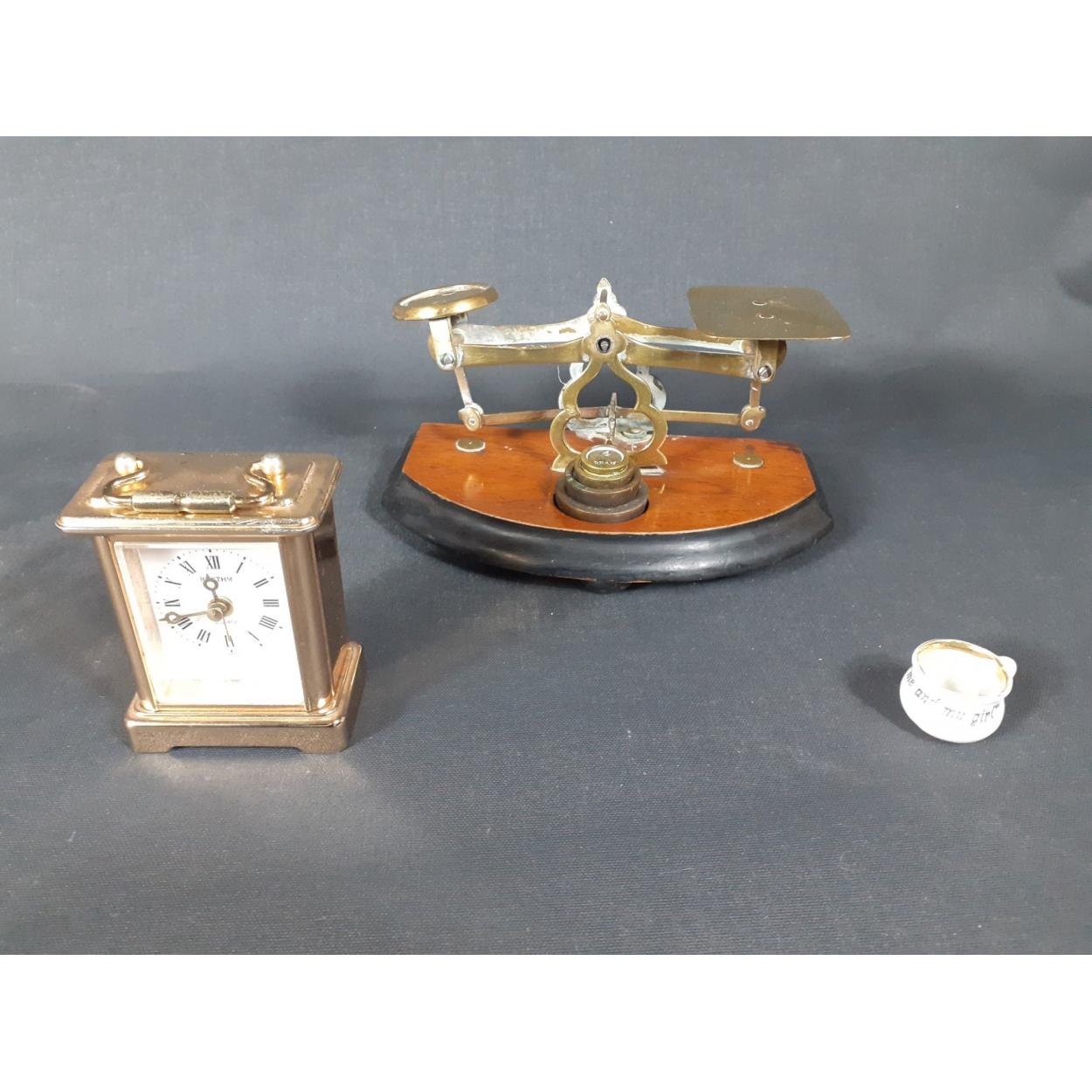 Vintage postal scales with four brass weights - 18cm across approx. Also included a small Rhythm battery carriage clock and a small ceramic chamber pot