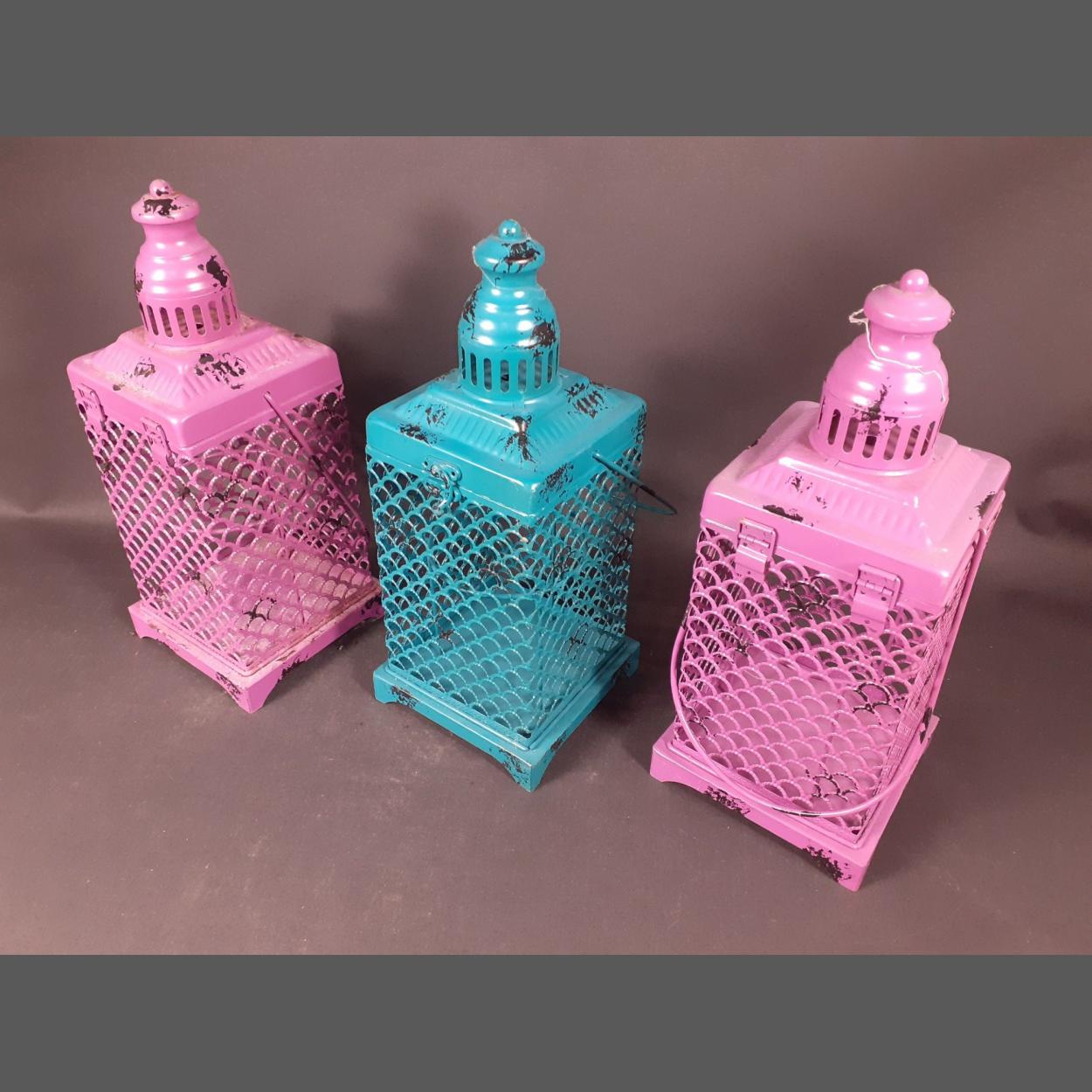 Three coloured outdoor lanterns, two purple and one turquoise. Each measures 35cm tall excluding handle.