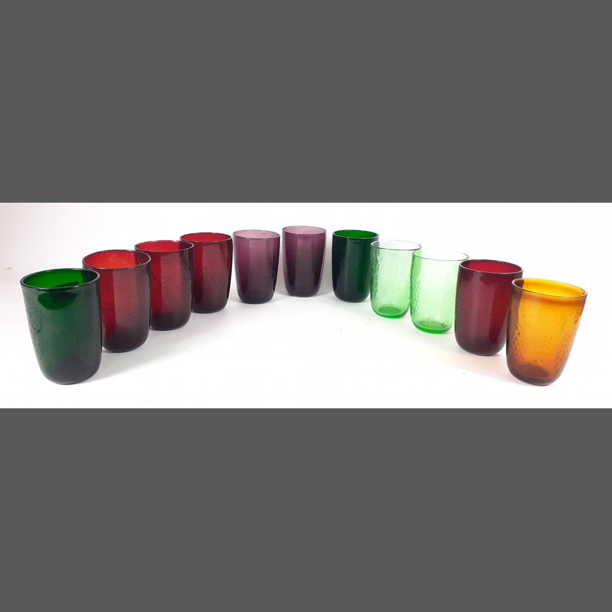 Eleven hand-etched coloured glass tea light holders 13cm high approx