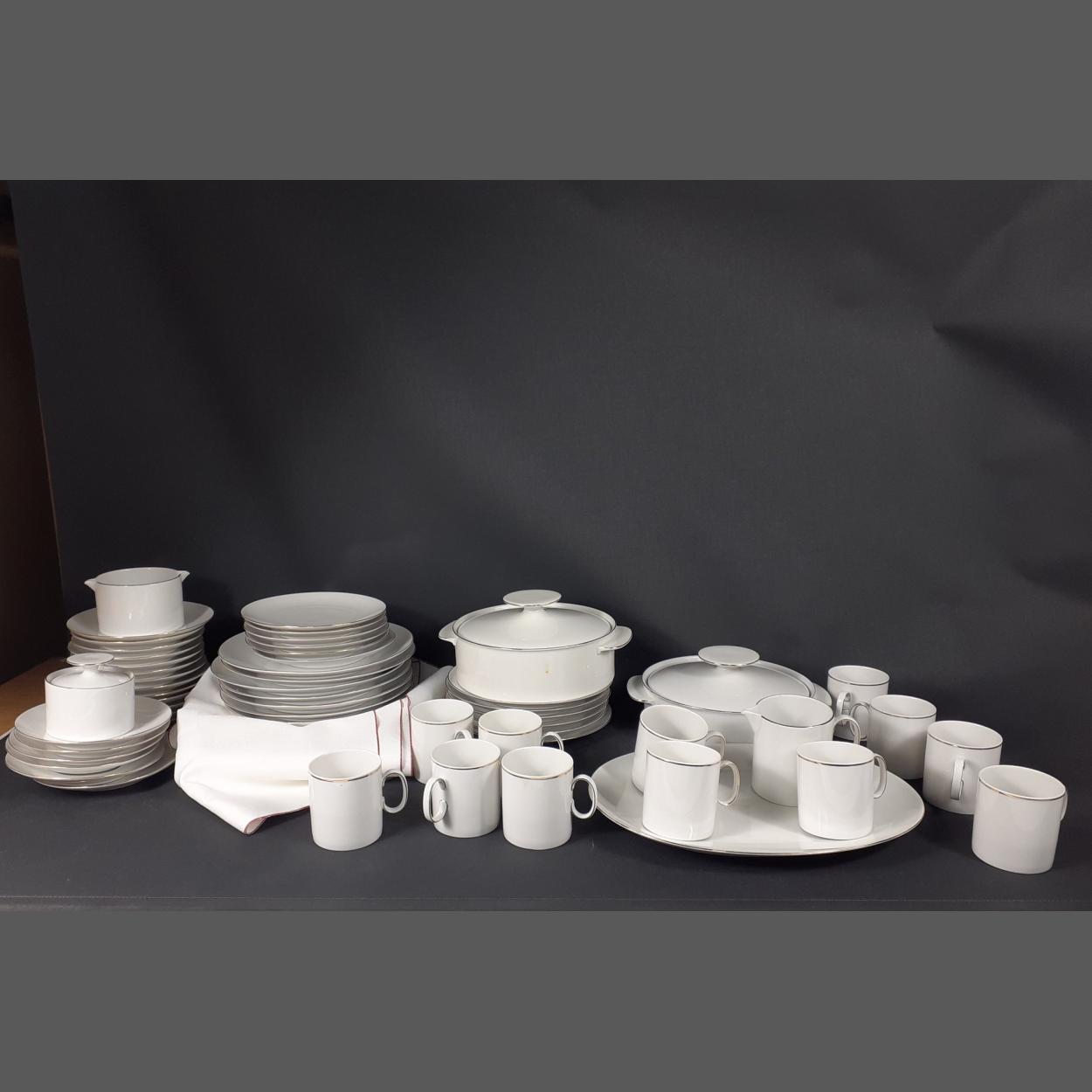 A smart THOMAS of GERMANY dinner service, white with a gilt trim, to include 12 cups, 12 saucers, 12 plates (17cm dia), 6 plates (21cm ), 7 plates (24cm), 1 sauceboat with underplate, 1milk jug, 1 sugar bowl, 1 ashet (34cm long approx), 2 lidded vegetable dishes ( 20cm dia approx) plus 6 napkins (white with red trim) and 11 cotton napkins (white with cut-out embroidery)