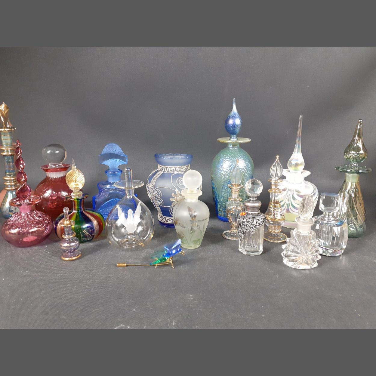 A collection of three fragile Middle Eastern glass perfume bottles, the tallest being 17cm high approx, plus some more substantial bottles from VILLAGE GLASS (13cm), DARTINGTON (11cm), a JENNY BLAIR bottle with a dragonfly design (9cm tall approx), a rainbow MURANO bottle (11cm tall approx), a TOUCH OF GLASS (18cm tall) and a small blue vase hand-made in Cyprus with a silver-plate overlay (11cm tall approx) etc