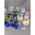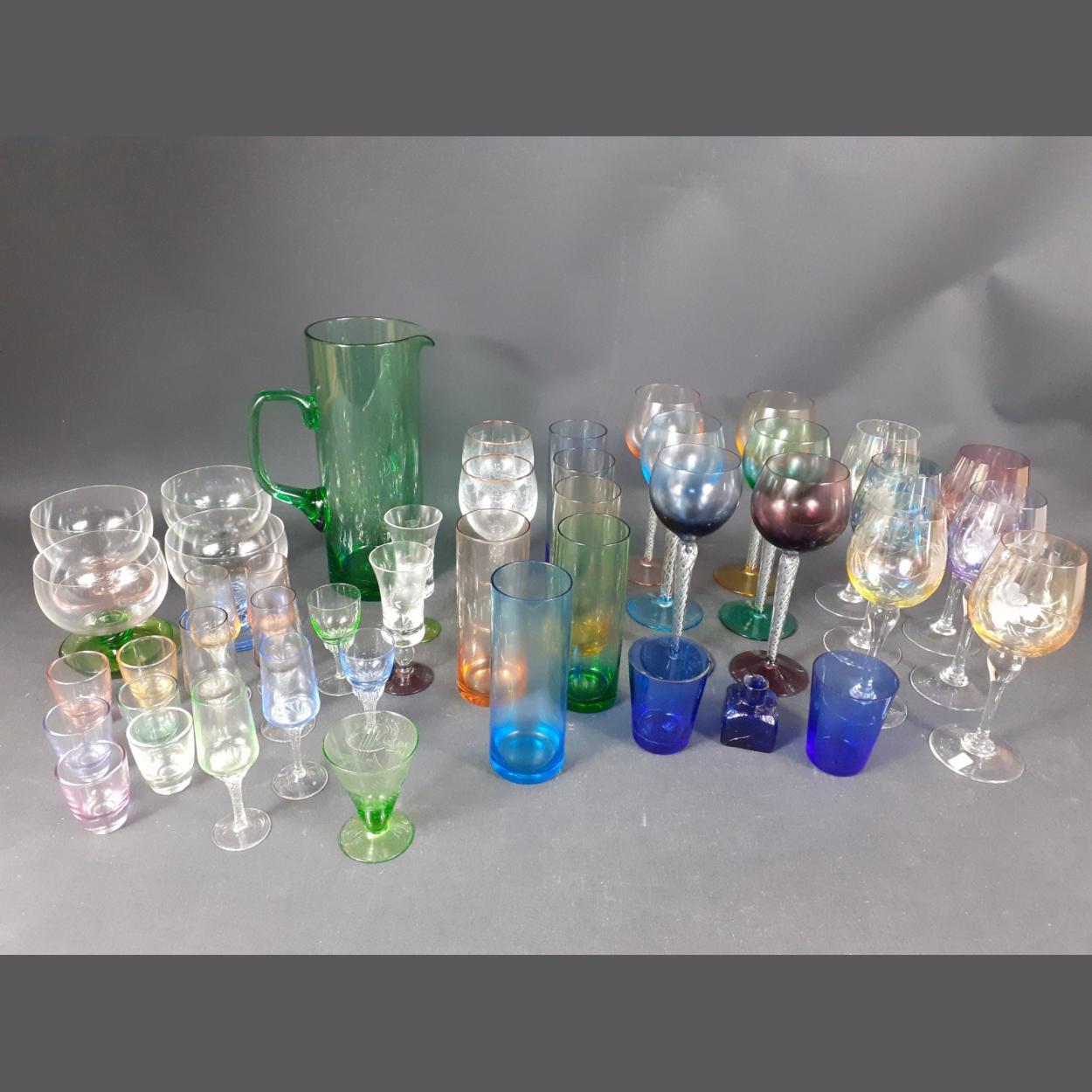 Colourful glassware to include 6 highball glasses, 6 sherry glasses, 6 hock glasses, 6 wine glasses with engraved flowers, 2 further hock glasses, 4 sundae glasses, 2 small blue beakers and a large green jug (25cm tall) etc