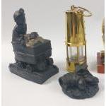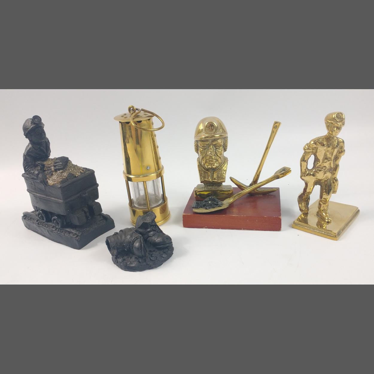 A selection of miniature mining items including a brass PROTECTOR LAMP (12cm tall), two BRASS FIGURES (10cm tall) and two small COAL AND RESIN figures largest 13cm tall
