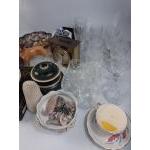 Two boxes of assorted glassware and household objects which includes 14 crystal glasses, place mat set depicting castles and much more