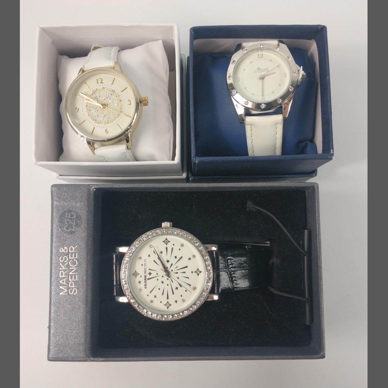 Two ladies SWEET DREAMS watches unused still in boxes, the first face is 3cm dia with lots of sparkly white stones in the centre, the other has 12 clear stones around the outside, face 3cm approx, plus a FRANK WALDER by M&S watch, face 4cm approx with multiple clear stones around the rim
