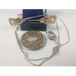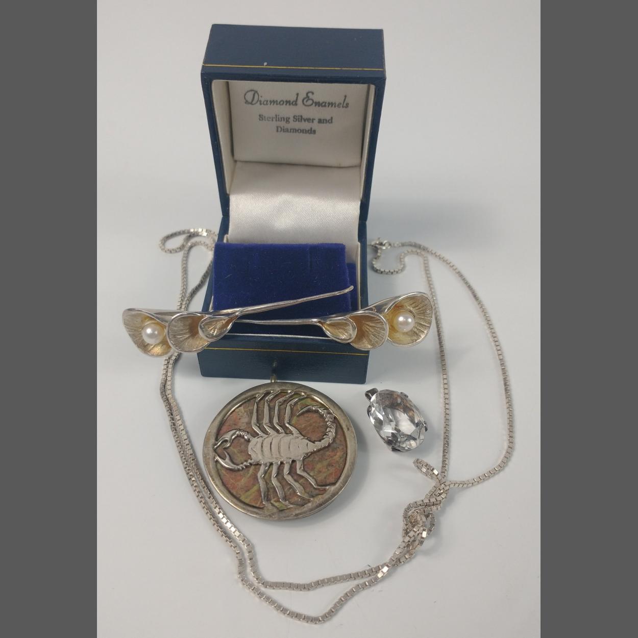 A mixed silver lot to include a chain (80cm approx), a pair of hoop earrings set with 'pearls' (6.5cm long), a circular pendant with a scorpion on agate (hallmark indistinct 4cm dia approx) and a small silver hallmarked (indistinct) pendant with a clear stone (2cm long), gross weight 46.50g