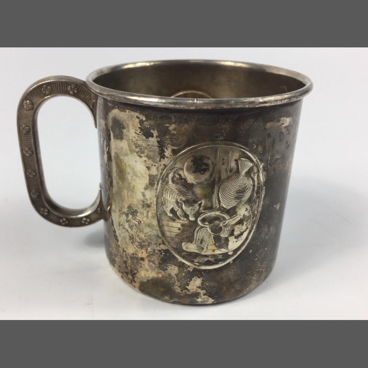 A white metal Christening mug stamped 830S N 25, possibly Russian, attractive panels of child with cat. 6cm tall approx. weight 70g approx