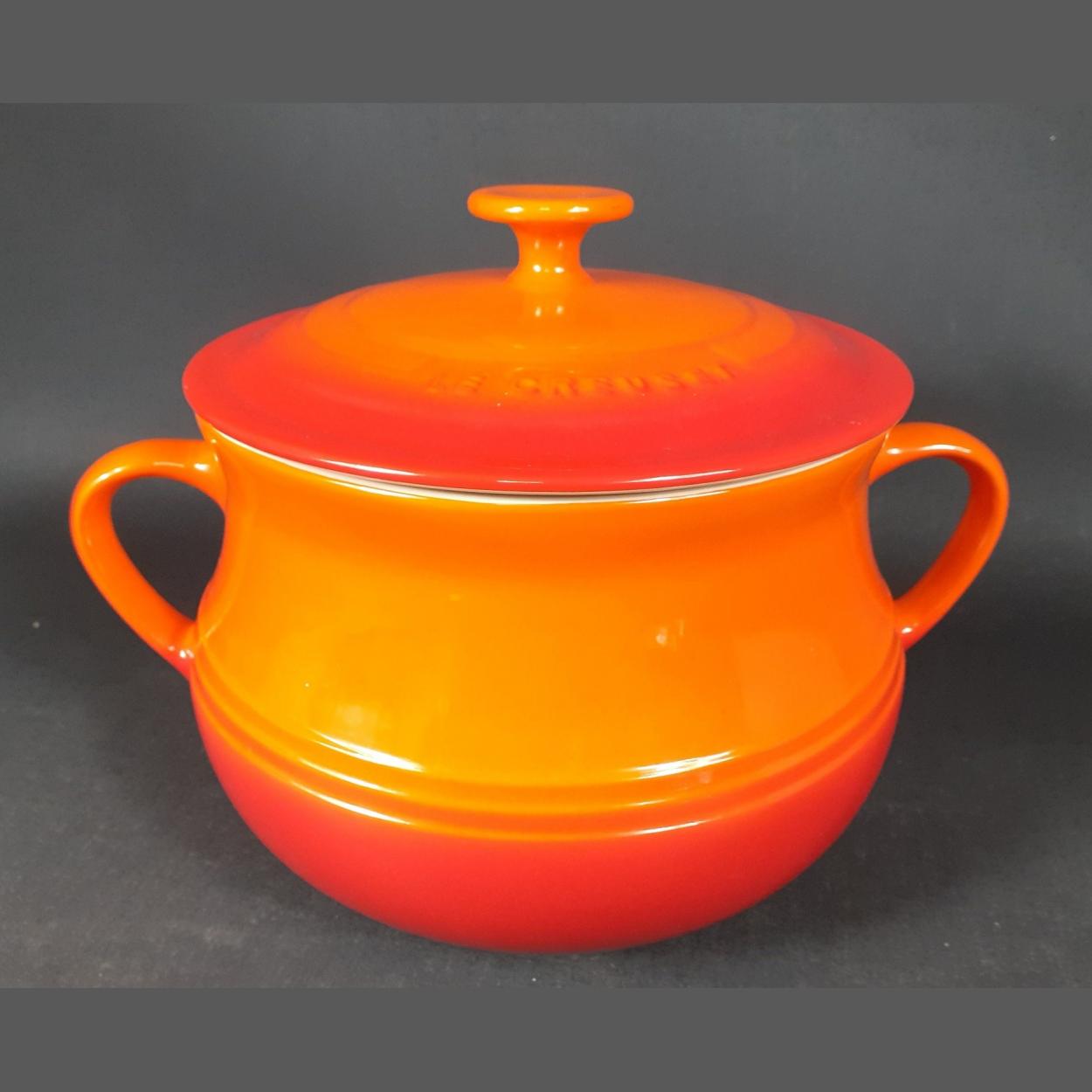LE CREUSET volcanic orange stoneware casserole dish. Complete with lid and in good condition. 20cm across at neck approx. 16cm high without lid approx.