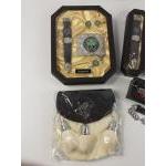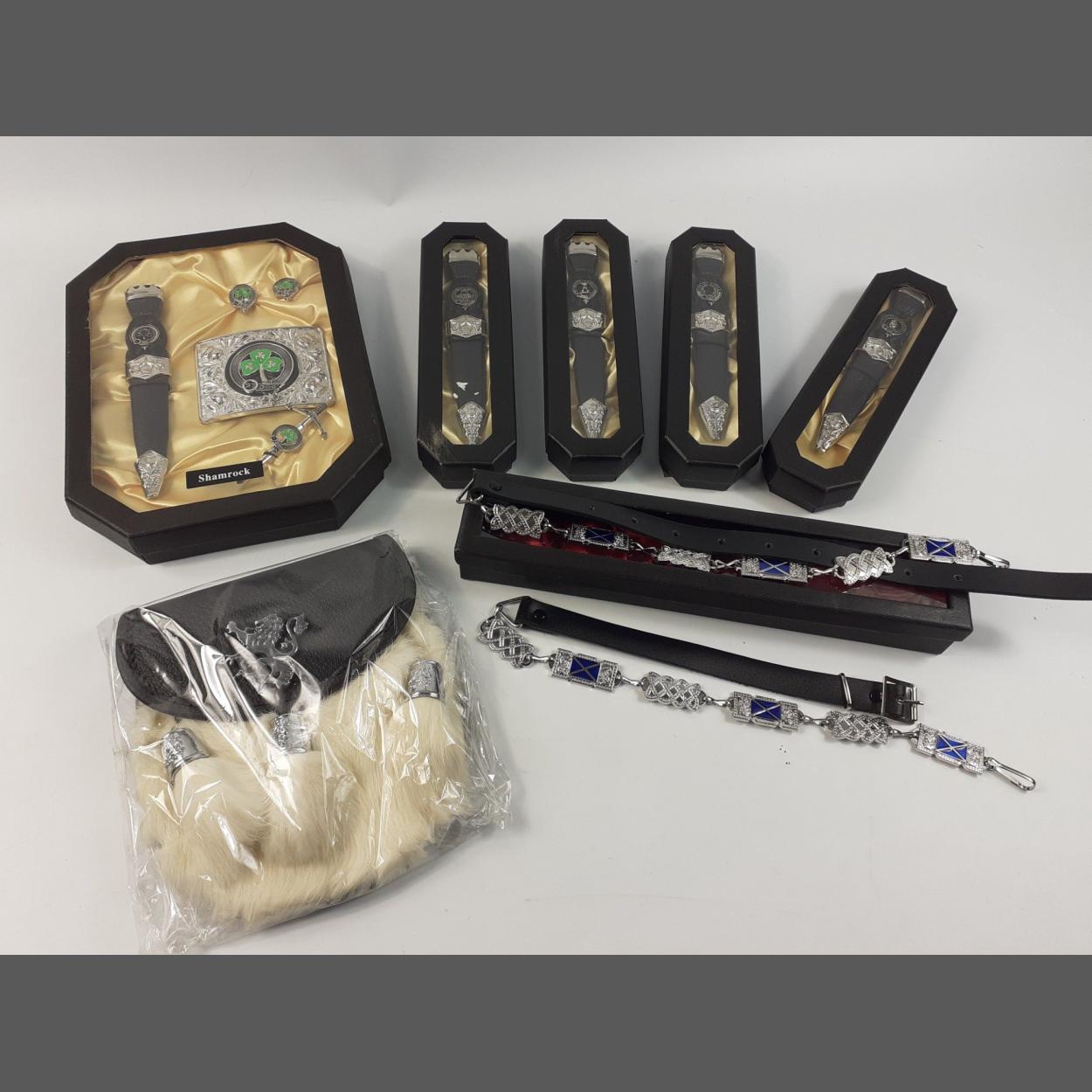 A collection of kilt accessories to include four clan SGIAN DUBHS (Clan MacArthur, Pringle, Malcolm/MacCallum, Lamont), a clan gift sets (Shamrock), a Celtic criss cross chain belt (size X large) and a sporran with lion tassels and white rabbit fur