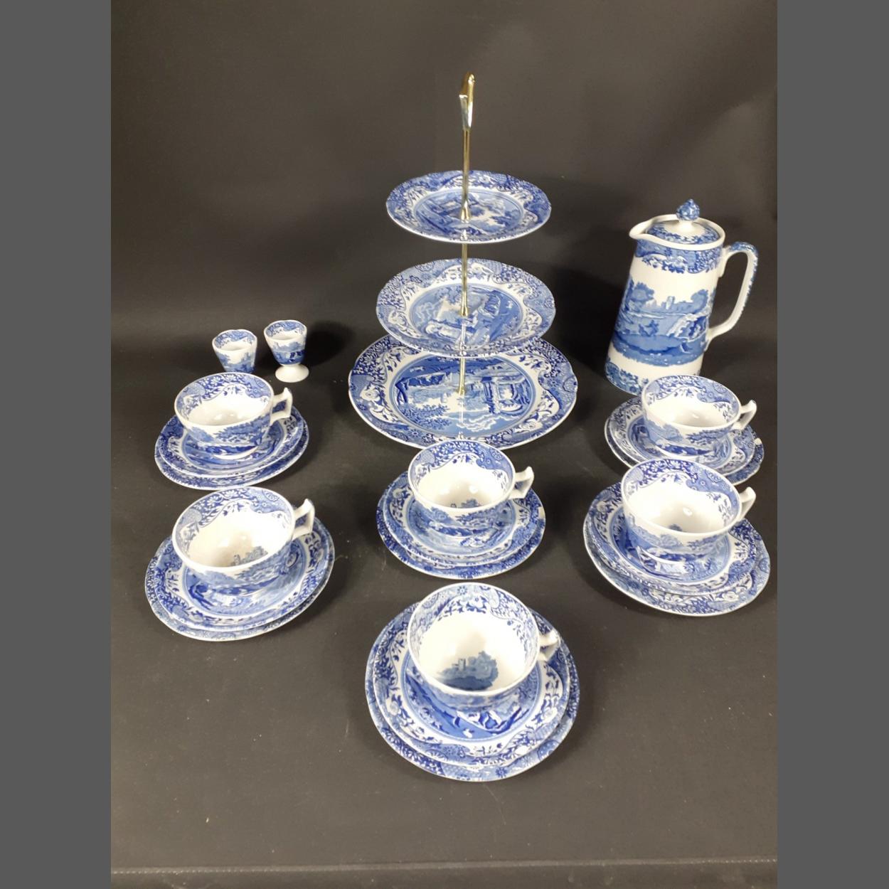 Collection of Copeland SPODE Italian pattern tea service items to include a three tier cake stand, coffee pot, six cups and saucers, six side plates and two egg cups. One chipped and one cracked cup otherwise condition good.