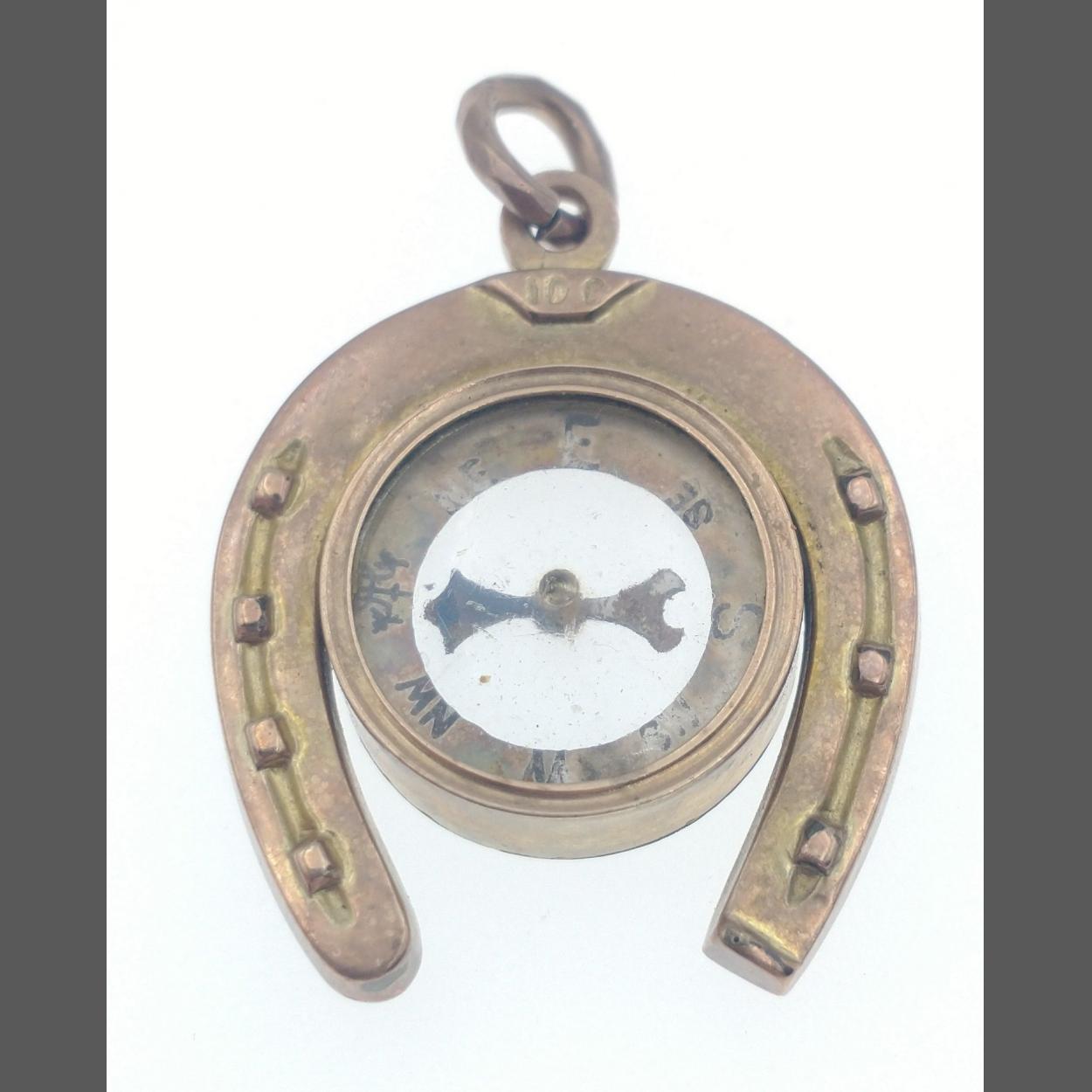 A 10k stamped yellow gold vintage HORSESHOE with a feature compass centred fob watch charm - 2.5cm long approx - weight gross 6.4g approx