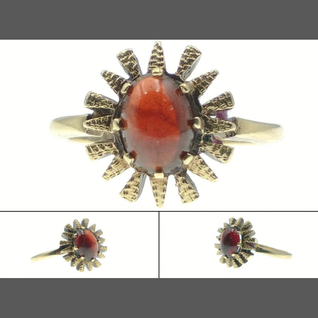 A 375 stamped yellow gold ring with red stone, Size N/O, gross weight 3.75g