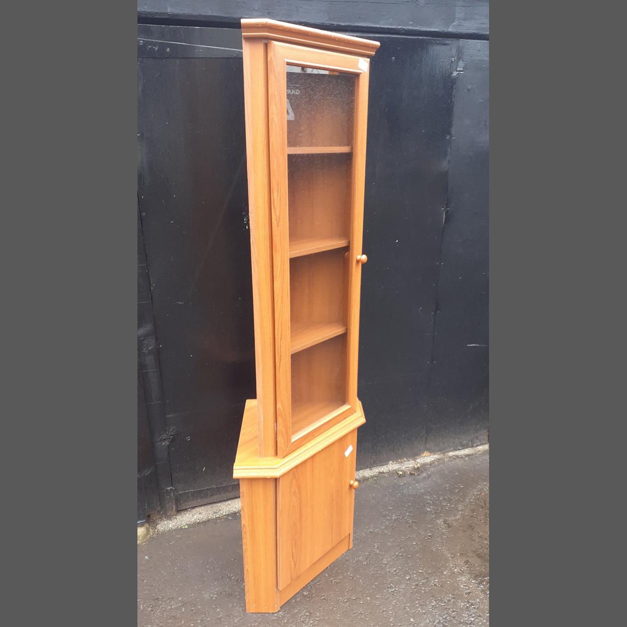 A SUBSTANTIAL corner cabinet complete with glass and cupboard. Dimensions- 180cm tall x 84cm wide at widest point.