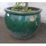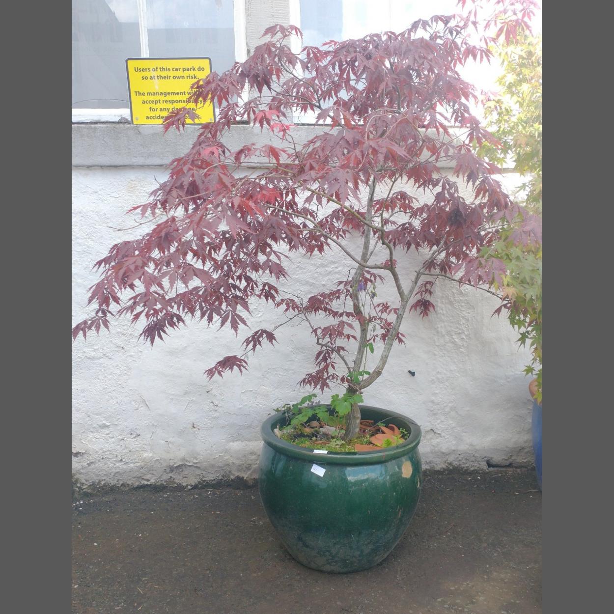 A SUBSTANTIAL green glazed ceramic garden planter including an impressive copper leaved JAPANESE ACER tree planting - dimensions of container 49cm height x 52cm diameter - height including the acer tree and pot 5ft approx - MIN STARTING BID £55 ARE INVITED