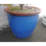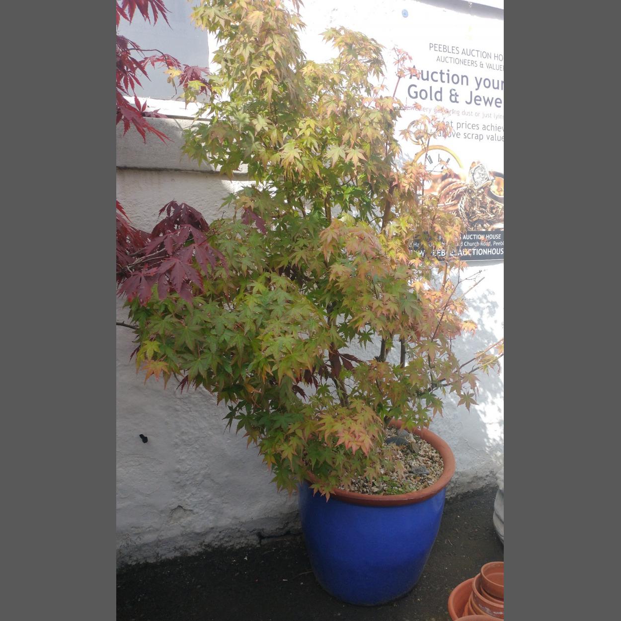 A SUBSTANTIAL blue glazed ceramic garden planter including an impressive green JAPANESE ACER tree planting - dimensions of container 49cm height x 50cm diameter - height including the acer tree and pot 5ft approx - MIN STARTING BID £55 ARE INVITED