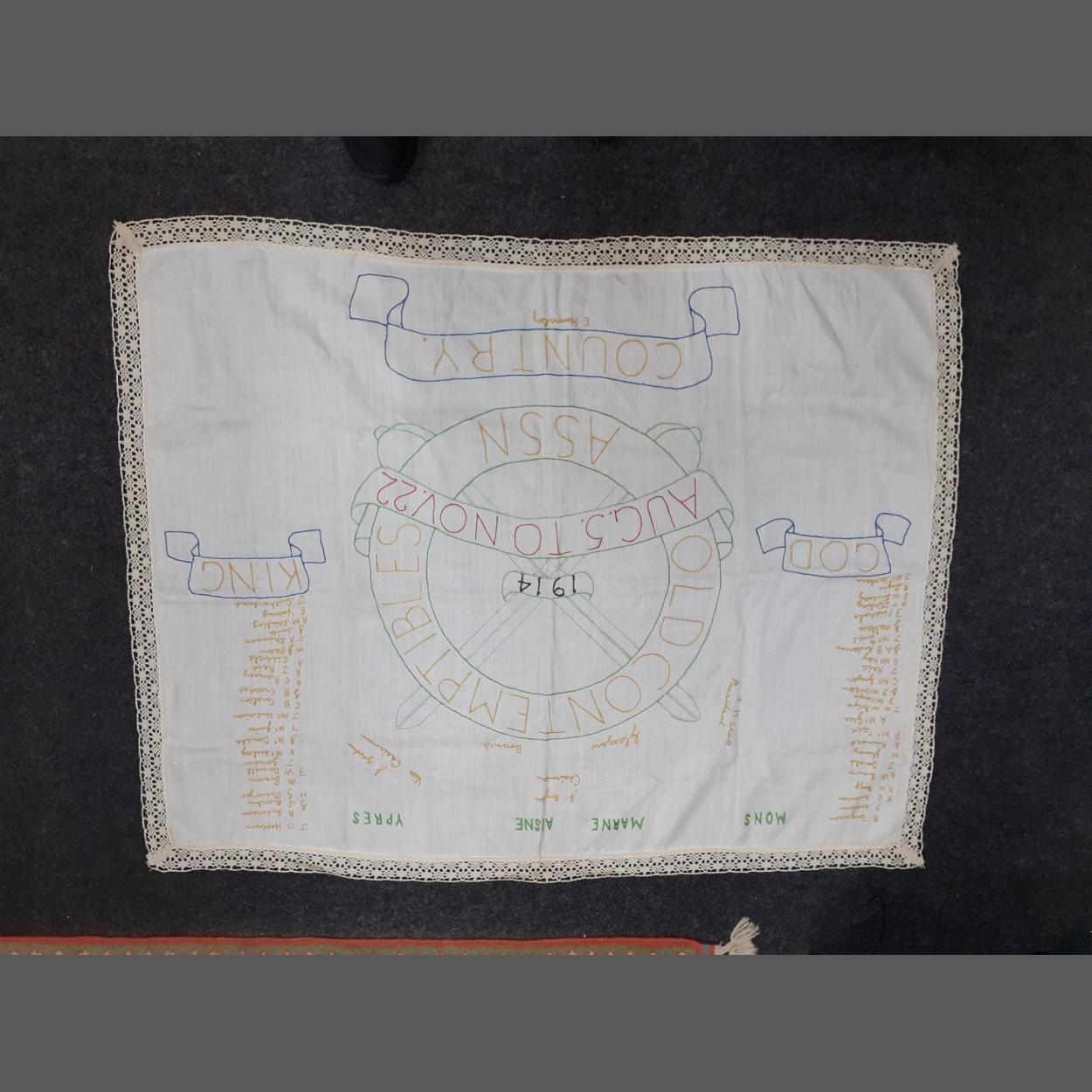 WWI GLASGOW VETERANS interest. Old Contemptibles Association hand stitched named commemorative tablecloth. Believed to be from a post war gathering where the veterans signed the cloth which would be later stitched. A true one off worthy of further research. Mentions MONS, MARNE, AISNE, YPRES. Measures 120 x 94cm approx.