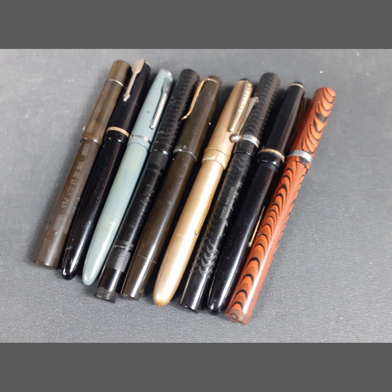 Vintage Fountain Pens. 9 in total to include, Osmiroid65 in silver grey, Osmiroid 65 in black, Iridio in black, Nicholas in black, Platignum in grey, Parker Junior in black with 14k nib, De La Rue in black with 14k nib, Burnham Junior in black and Platignum in attractive brown and black ripple effect