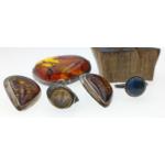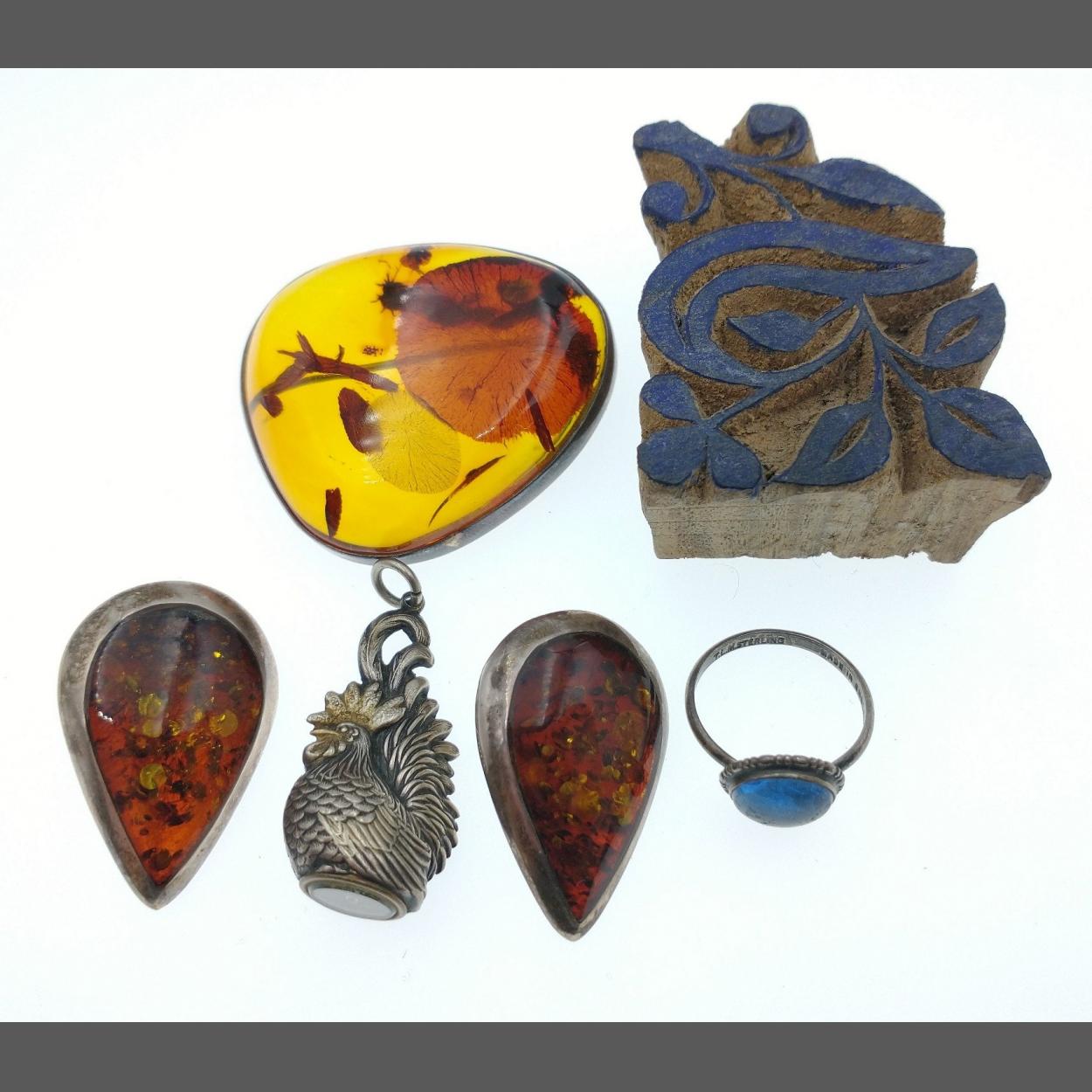 A small collection of 925 stamped amber/resin jewellery to include a pair of clip-on earrings (3cm long) and a pendant (4cm long), gross weight 23.50g plus a white metal cockerel pendant (3cm long) with a tiny compass in its base and a ring stamped Sterling with a blue stone Size K,