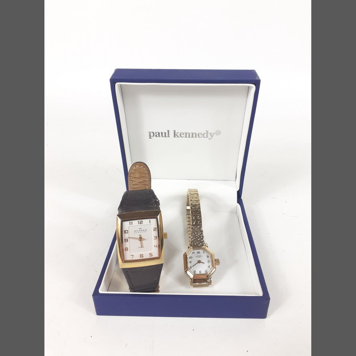 Two watches, the first being a ladies SKAGEN watch 523SXGLDW with a leather strap (needs a new battery), and a ladies ROTARY watch with an expanding bracelet in good working order
