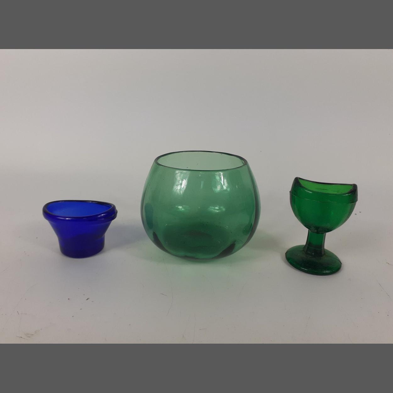 A VIBRANT lot of Vintage glass to include an ANTIQUE APOTHECARY blue OPTREX SIGHT glass 5.2cm wide as well as two green glass wares 6cm wide and 4.1cm wide and a small paperweight. All good condition