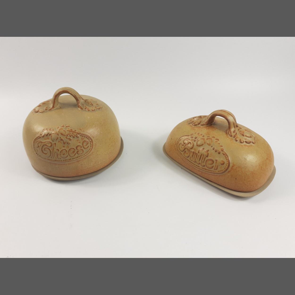 Two matching SCOTTISH STUDIO POTTERY cheese and butter dishes - cheese dish 15cm height x 16cm diameter and the butter dish height 9cm x length 18cm x width 12cm approx - both with their plates