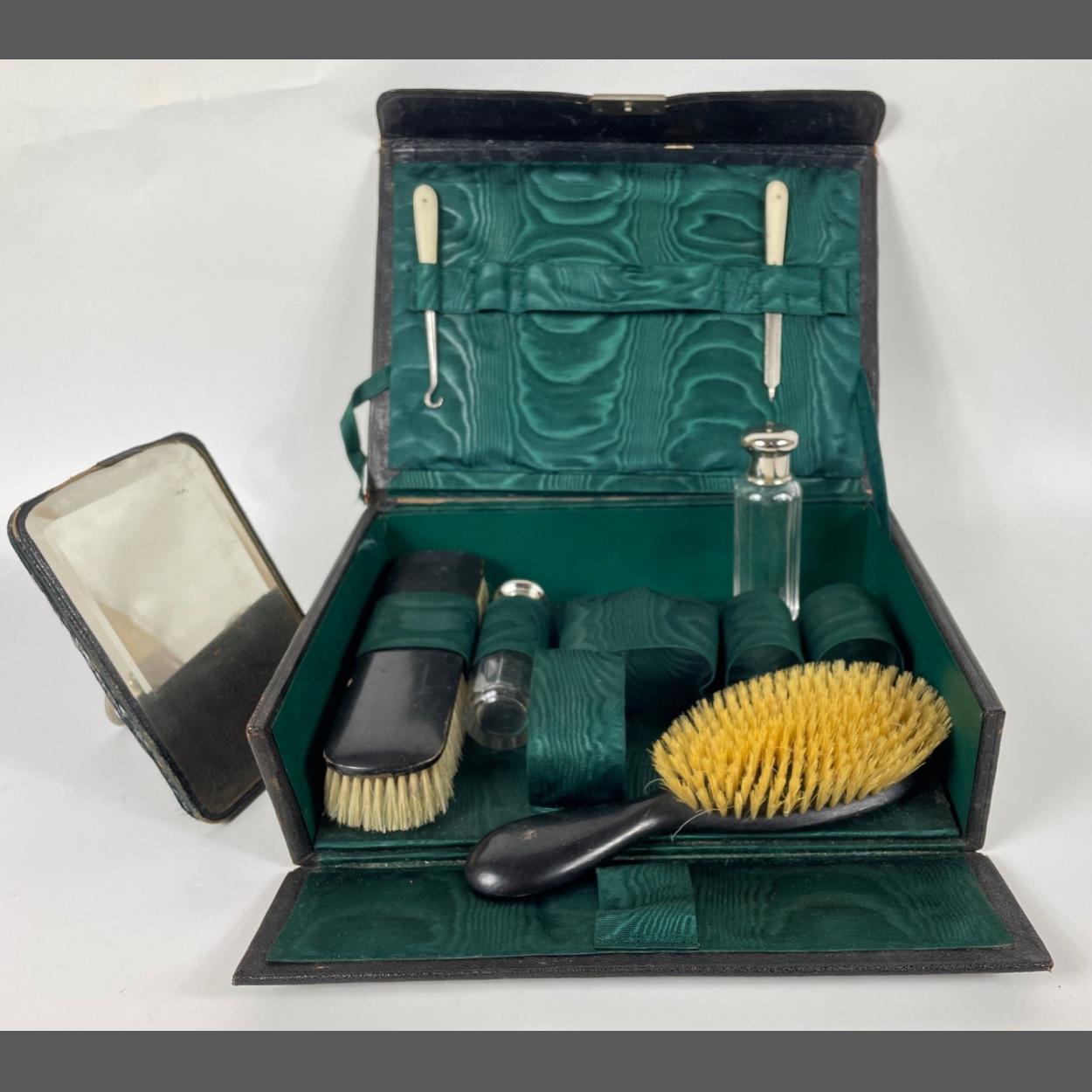A FANTASTIC Green vanity set with a washed satin inner lining, although incomplete, the vanity set is of exceptional quality. Includes brush, comb, two bottles, mirror and nail files. Height 20.3 cm, width 28.5 cm.
