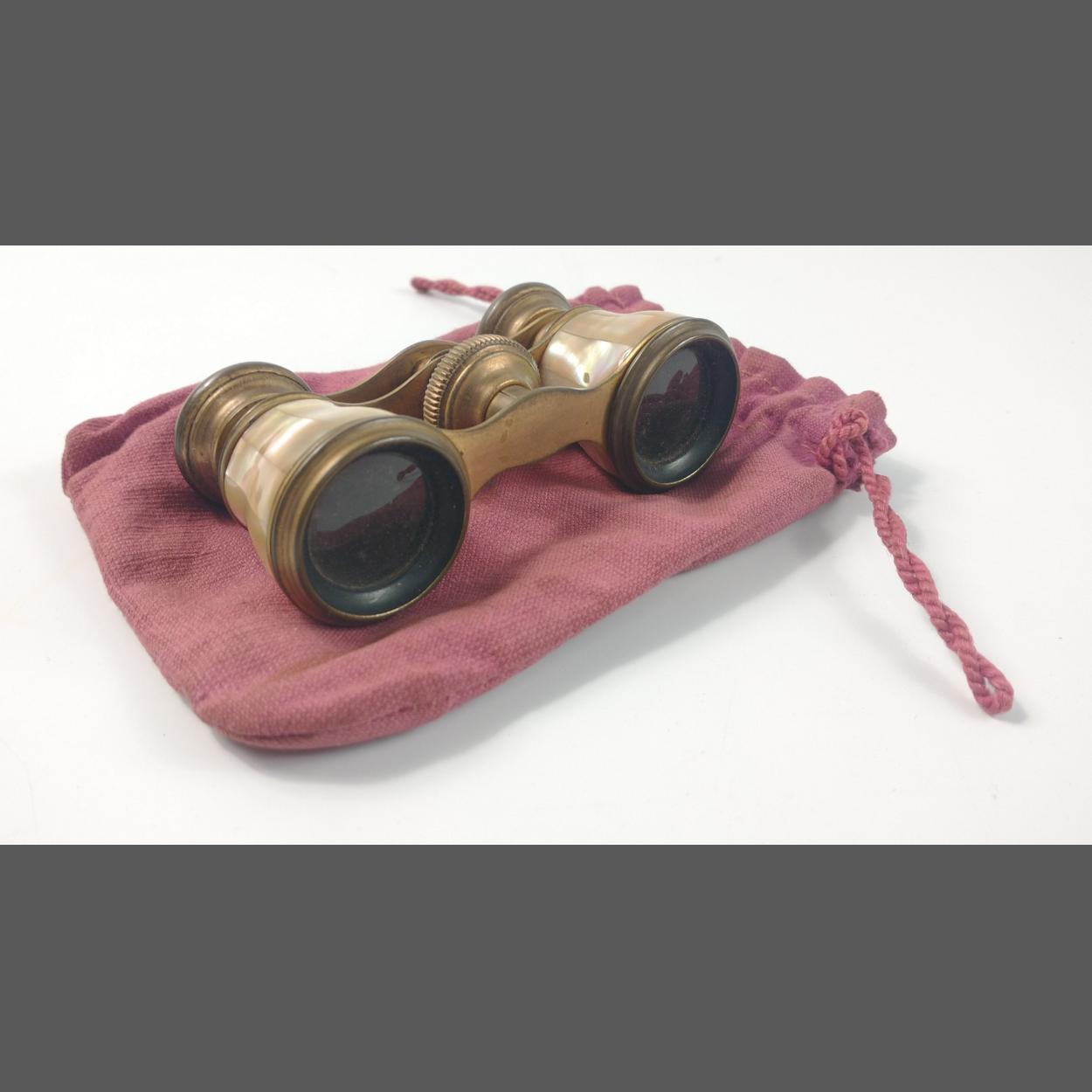 A pair of vintage mother-of-pearl and brass OPERA GLASSES in their own pouch, only 9.5x4.5cm in size