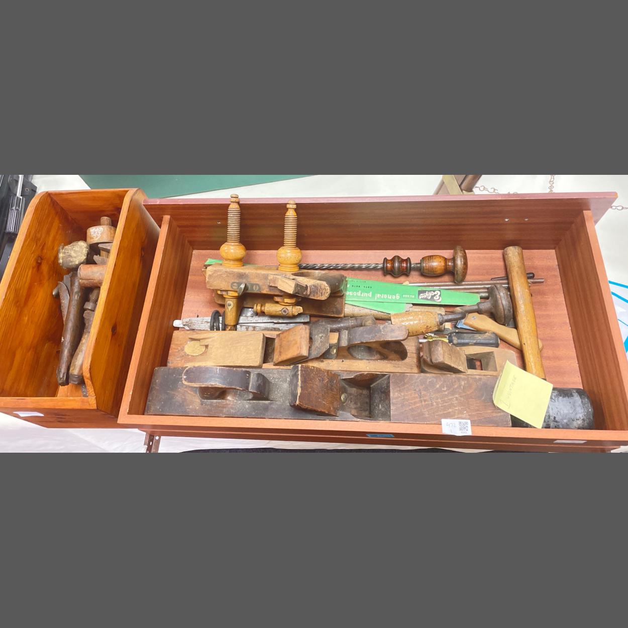 An interesting wooden box & old drawer of antique and vintage tools, including a really old Adjustable STILSONS spanner/wrench, a double sided copper & Hide Panel Beating Hammer, 2 brass & wood spirit levels, A mortice and marker gauge, a nylon hammer, vintage socket sets, corkscrew bradawls etc PLUS - an old drawer full of Vintage woodworking tools, including a superb working Antique Archimedes Hand Drill, 3 Vintage block planes with blades (Very Large, Medium & Small), Antique Moulding/Edge Plane with 9 separate Chisels, Vintage Coopers Mallet, Hand drill etc