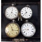 A lacquer box containing four silver pocket watches. Gross weight 430g approx